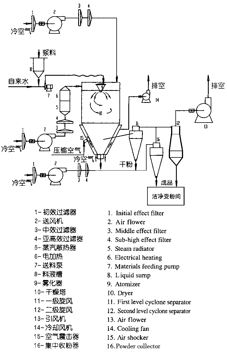 - 塔徑塔高作了相應(yīng)的調(diào)整,既保證粉料干燥之前達(dá)到不到塔壁,又可保證粉料的熱風(fēng)停留時(shí)間而完成低溫干燥;它比設(shè)有加套冷風(fēng)冷卻裝置,確保料液不會(huì)粘結(jié)在塔壁上因局部溫度過高而產(chǎn)生軟化、熔融甚至焦化現(xiàn)象;錐度增大,錐體上安裝空氣震擊器,用壓縮空氣脈沖式地震擊筒體,把吸附在筒體上的粉料順暢地?fù)袈湎聛恚?